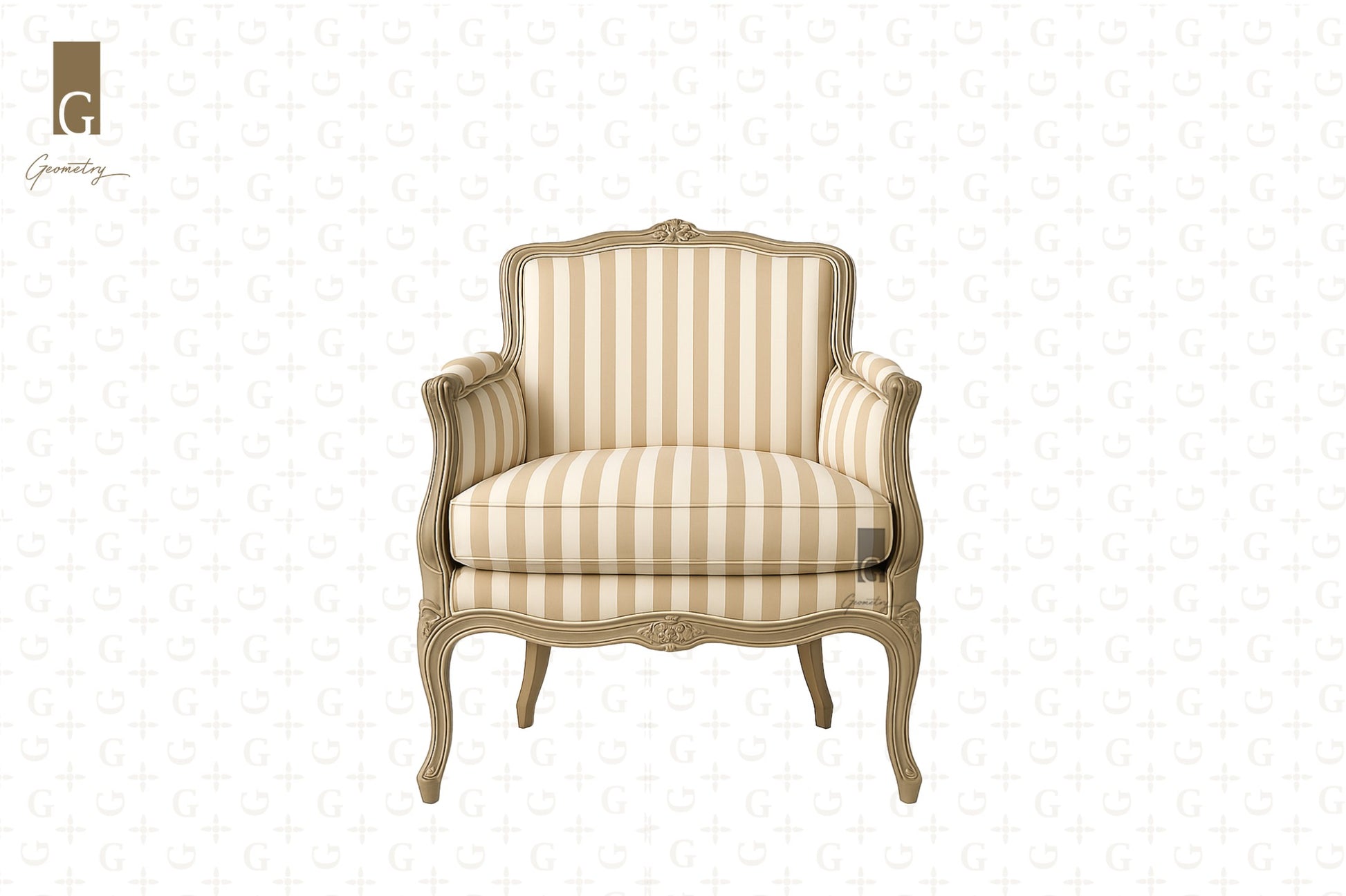 The Game of Stripes Armchair brings royal nostalgia into the modern era — a throne reimagined for today’s interiors. Its hand-carved teakwood frame, graceful cabriole legs, and sculpted arms echo French grandeur, while the bold striped upholstery adds a playful twist of contemporary character.