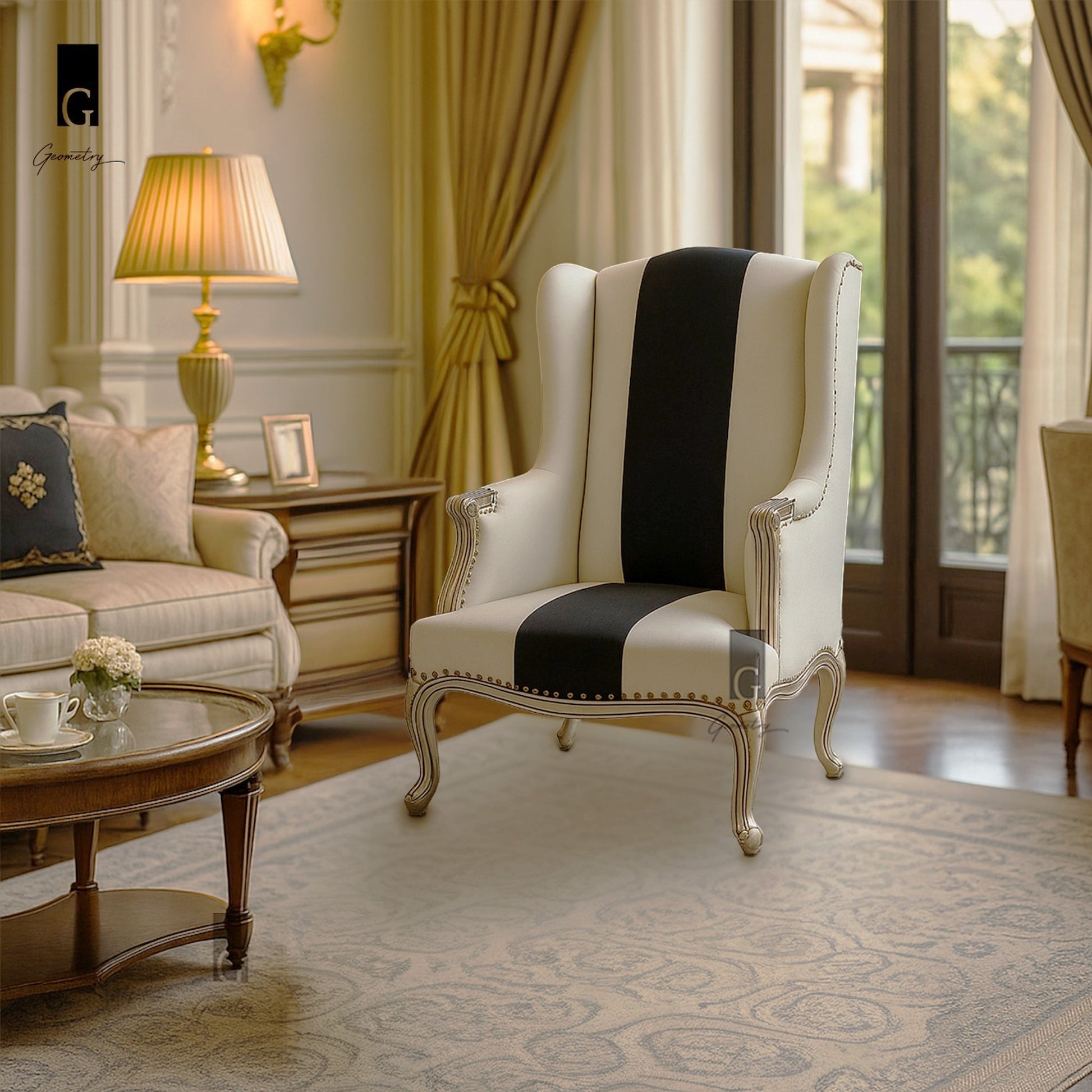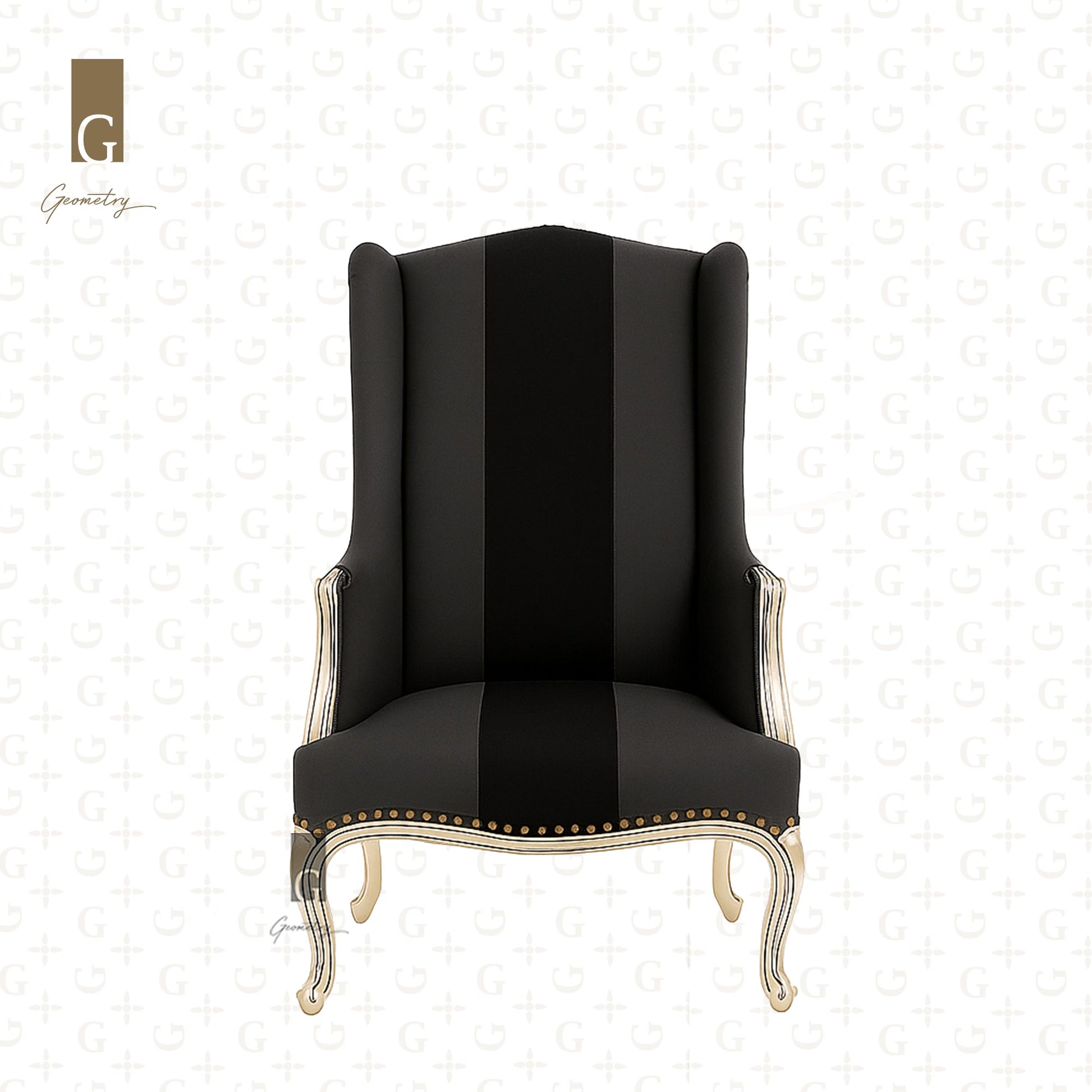 The Line of Duty Chair embodies authority with artistry. Its sharp wingback silhouette, slim upward-sweeping arms, and towering back evoke thrones of command. Metallic sheen on carved legs and arms adds polish and OTT luxury, while studded rivet trims along the base and sides recall the precision of a military uniform.